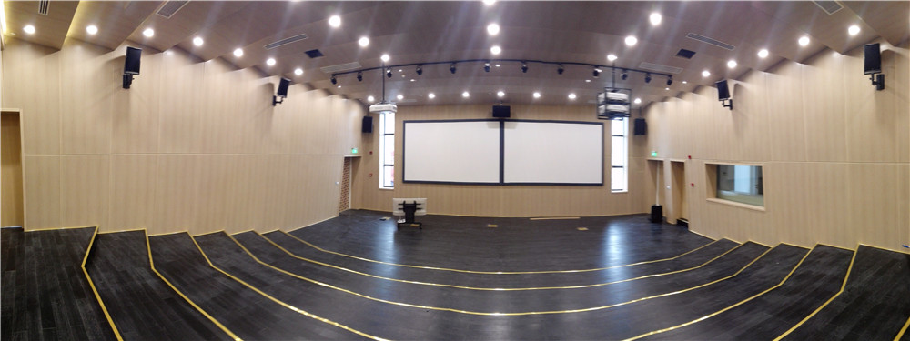 整個系統(tǒng)的擴聲都使用了英國LA Audio的音箱以及功放??紤]到現(xiàn)場的實際情況,多個房間需要實現(xiàn)信號的互聯(lián)互通,并且各個房間之間都存在一定的距離,傳統(tǒng)的模擬線路傳輸方式很難實現(xiàn),故選擇了在每個房間都安裝了Attero Tech的Dante網(wǎng)絡傳輸面板,利用網(wǎng)線進行音頻信號的傳輸。其中報告廳為7.1聲道系統(tǒng),使用三只LA Audio的Eva12.1分別作為左、中、右主擴聲,四只Eva8作為環(huán)繞聲,兩只Eva15b作為超低音。音樂進入DENON的DN-500AV進行解碼分別送到7.1系統(tǒng)當中,話筒音源接到Attero Tech的網(wǎng)絡面板UNDx4I。