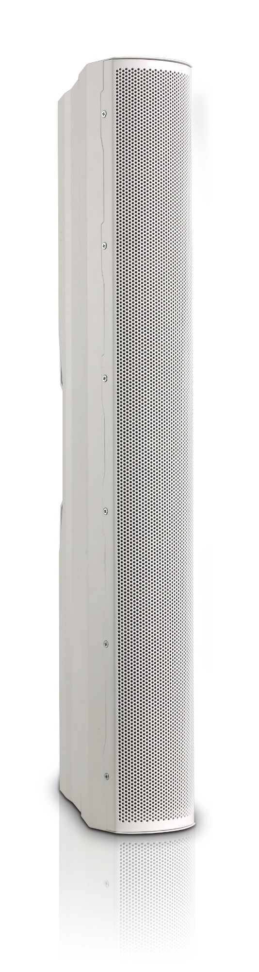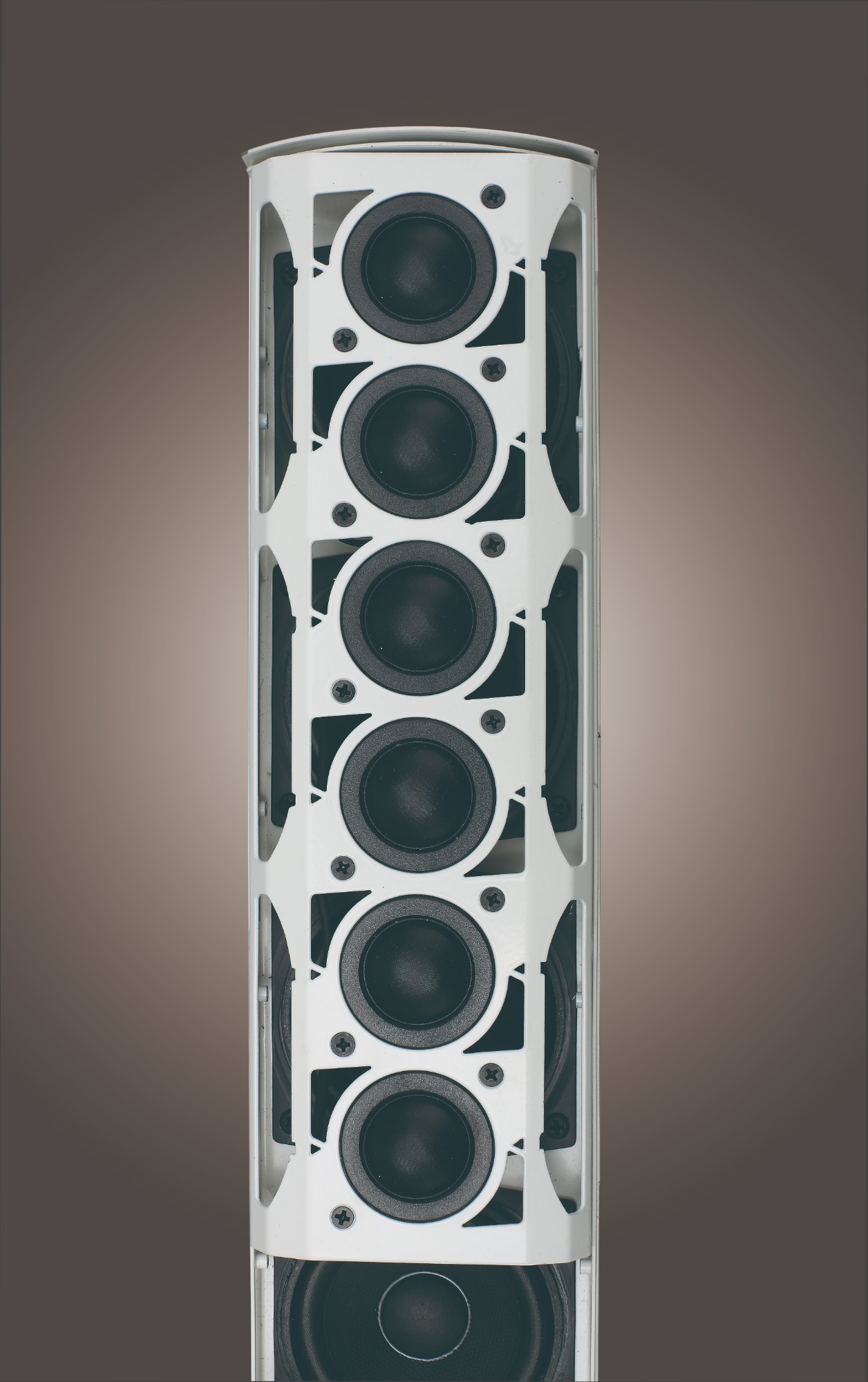 Caro8.3 箱體采用SS400 鍍鋅鋼然后再加上表面噴粉,可有效防止腐蝕。箱體兩側(cè)使用折疊式設(shè)計再加上丁基橡膠阻尼材料,外觀修長美觀又以有效減少機械共振。Caro8.3擁有8個3英寸的低音單元負責中低頻,8個低音單元排列緊密,有效提升垂直指向性并保持一致的垂直波束寬。Caro8.3上部還有6個高音單元安裝在低音單元的前面,可給高音低音的交叉區(qū)域提供更一致的指向,6個球頂高音可將頻率上限超越20kHZ。音箱的無源分頻網(wǎng)絡可提供更好的頻率響應和精準的聲音。音箱內(nèi)置50W 變壓器,并設(shè)計有三檔調(diào)節(jié)(12.5W/25W/50W), 為您在大型安裝使用時提供更大的便利。高音部分安裝在機箱頂部的設(shè)計允許一只Caro8.3倒置與另一只Caro8.3 拼接時仍然可以保持非常平滑的響應。